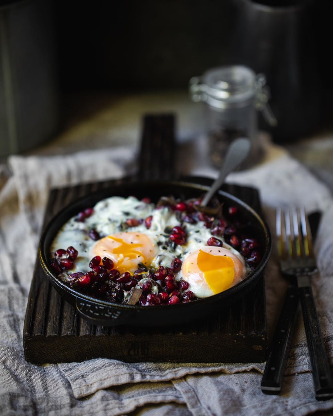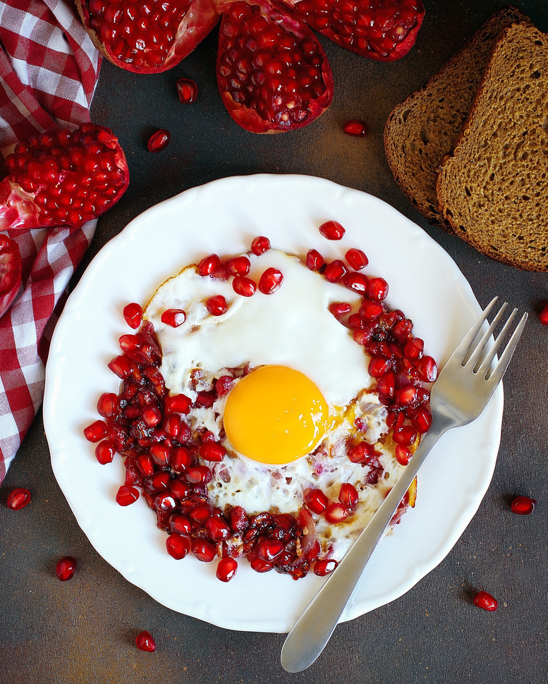 Bir tavada kərə yağını əridib üzərinə soğan tökün. Qızılırəng alanadək soğanları 10 dəqiqə qovurun. Üzərinə təmizlənmiş nar dənələrin töküb, qapağın qapısını örtün təxminən 10 dəqiqə zəif ocaqda bişirin. Daha sonra yumurtaları sarısın dağılmadan tavaya qovrulmuş narın üstünə sındırın. Duz və istiot səpib 5 dəqiqə yumurtaları da bişirin. Zövqə görə yeməyin üstünə doğranmış keşniş səpib süfrəyə verə bilərsiniz.