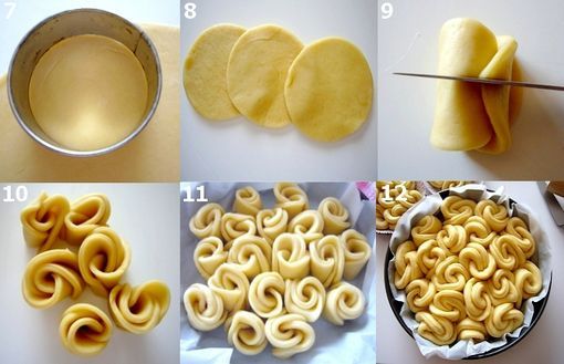 Bir qabda ilıq süddə şəkər tozu və mayanı qarışdırın. Köpürməsi üçün 10 dəqiqə üstünü örtüb kənarda saxlayın. Dərin bir qaba un və duzu tökün. Orta hissəsinə 2 ədəd yumurtanın sarısını, mayalı südü və yumşaldılmış kərə yağını əlavə edin. Mikserin xəmir başlığı ilə və ya əllə 10 dəqiqə yoğurun. Yoğurduğunuz xəmirin üstünü nəmli mətbəx dəsmalıyla örtüb 2 saat acıması üçün kənara qoyun. Xəmiri oxlovla açıb, 7-8 sm-lik peçenye qəlibləriylə dairələr kəsin. 3 dairəni üst-üstə düzüb yuxarıdan aşağıya doğru qatlayın. Daha sonra orta hissəsindən ikiyə bölün. Eyni qaydayla bütün dairələri kəsin. Dairəvi soba sinisini yağlayın, gül forması olan hissəsi üstdə qalmaq şərtiylə siniyə yerləşdirin. Mayalanması üçün 1 saat dinləndirin. Çox sıx doldurmayın, çünki 1 saat qaldıqda xəmir qabaracaq. Üzərinə şəkər qatılmış südü fırçayla yaxıb əvvəlcədən 180 dərəcə qızdırılmış sobada üzəri qızarana qədər 25-30 dəqiqə bişirin. Zövqə görə hazır çörəyin üzərinə şəkər kirşanı səpərək süfrəyə verə bilərsiniz.