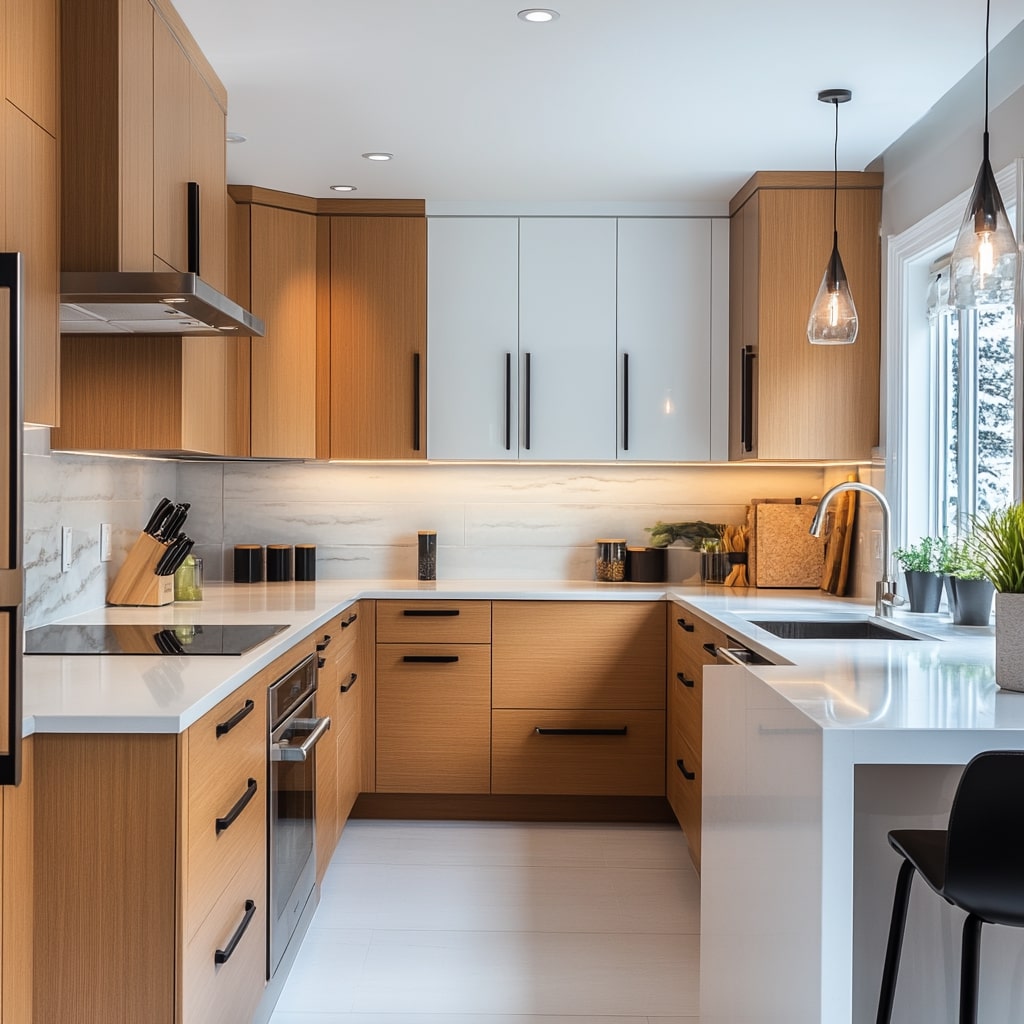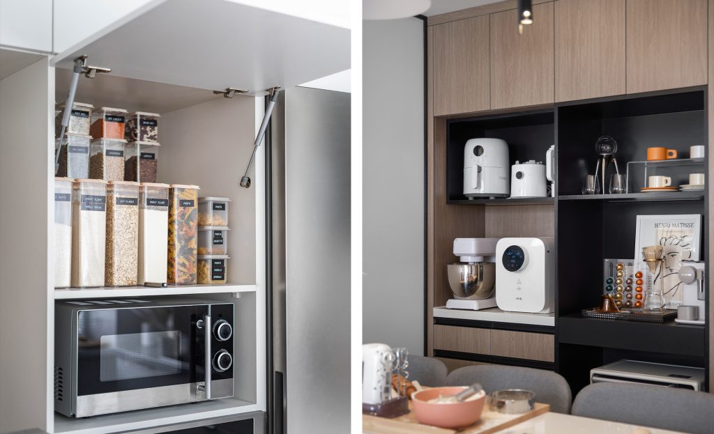 - Lazımsız hərəkətləri minimuma endirmək üçün soba, çanaq və soyuducu düzgün planlaşdırılaraq yerləşdirilməlidir. Bu yanaşma elektrik rozetkalarının da optimal mövqedə olmasını təmin edir ki, cihazlar həm əlçatan, həm də səliqəli şəkildə yerləşdirilsin. Yerə qənaət etmək üçün quraşdırılmış mikrodalğalı soba və ya qabyuyan maşın kimi cihazlar üçün ayrıca yer ayırmaq vacibdir.