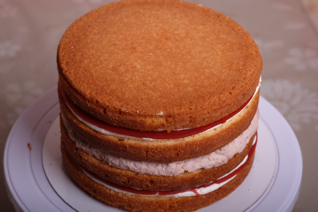 Soyuducuda saxladığınız biskvitləri 2 hissəyə bölün, 4 ədəd korj alınacaq. Tort qabına korjun birini qoyub üzərini mətbəx fırçasıyla siropla isladın. Kremi konditer torbasına töküb isladılmış korjun üzərinə spiralvari krem sıxın. Daha sonra hazırladığınız marmeladı dairəvi şəkildə kəsib kremin üzərinə yerləşdirin. Üzərinə yenə krem sıxıb ikinci korju yerləşdirin. Korjun üzərinə çizkeyki də yerləşdirib 3-cü korju qoyun. Yenidən siropla isladıb kremləyin. Qalan marmeladı da qoyub kremləyin. Ən sonda 4-cü korju da qoyub tortun hər tərəfini kremləyib hamarlayın.
