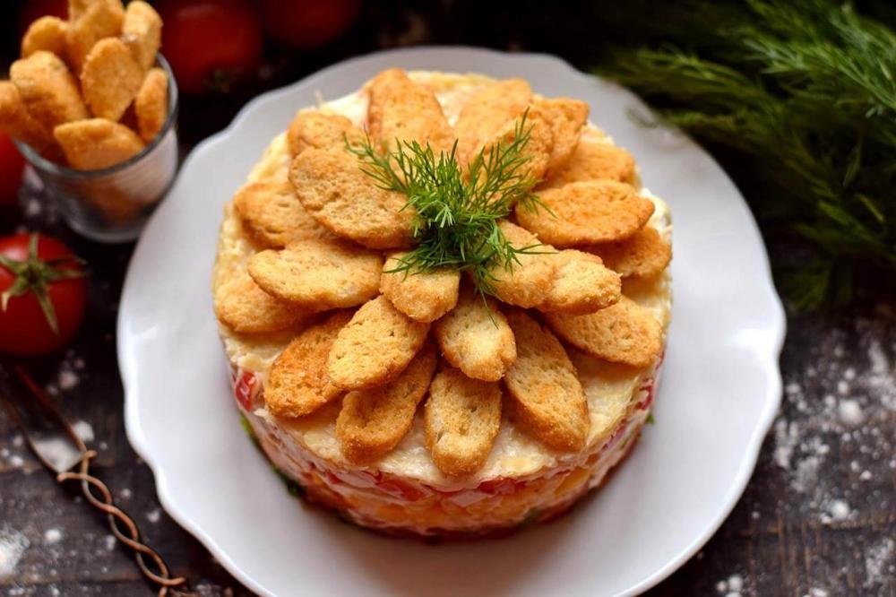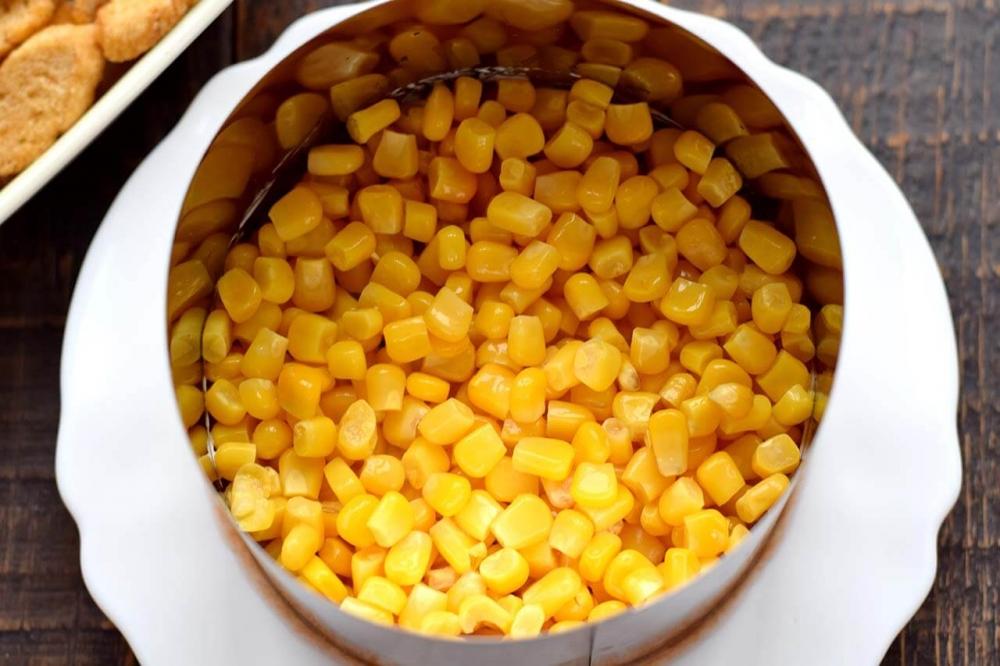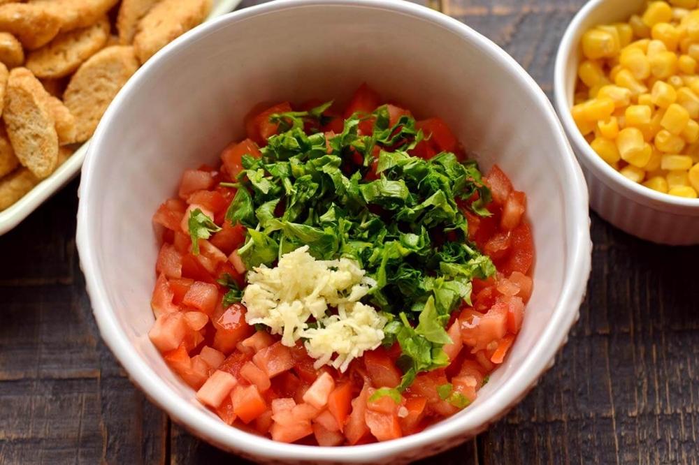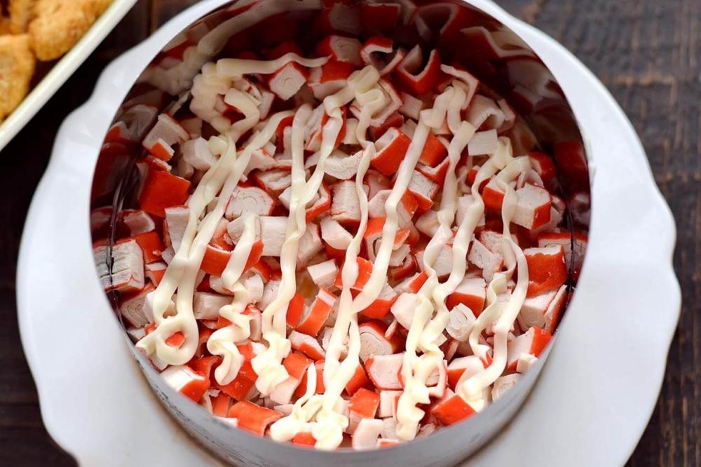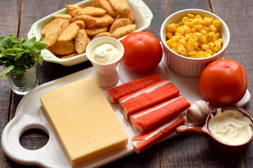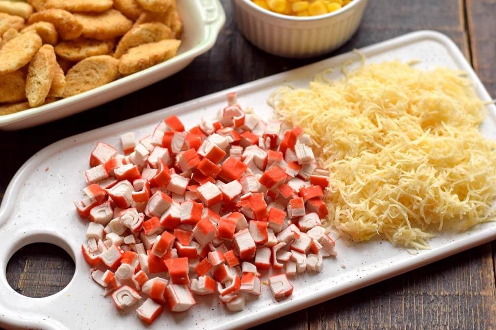 İlk öncə pomidorları yuyub orta ölçülü kub formasında doğrayın. Cəfərini doğrayıb pomidorların üzərinə əlavə edin. Bir qabda doğranmış pomidor, göyərti və sarımsaqəzəndən keçirilmiş sarımsaq əlavə edib qarışdırın. Bu qarışığı 10 dəqiqəlik kənara qoyun. Pendiri sürtgəcdən keçirin. Krab çubuqlarını da kub formasında doğrayın. Pomidor qarışığını süzgəcə töküb artıq suyunu süzün. Diametri 16-18 sm olan açılan formanı salatı hazırlayacağınız boşqaba yerləşdirin. İlk qata göyərti və pomidor qarışığını töküb yayın. Üzərinə duz səpin. Bir qabda xama və mayonezi qarışqırıb salata töküb yayın. Qarğıdalının da süzgəcdə suyunu süzün. Daha sonra salata 2-ci qat olaraq qarğıdalı dənələrini düzün. Üzərinə doğranmış krab çubuqlarını səpib mayonez yaxın. Üzərinə sürtgəcdən keçirilmiş pendir səpib mayonez yaxın. Salatı soyuducuya yerləşdirin. Süfrəyə verməzdən əvvəl açılan formanı çıxarıb üzərini suxari və göyərtiylə bəzəyin.