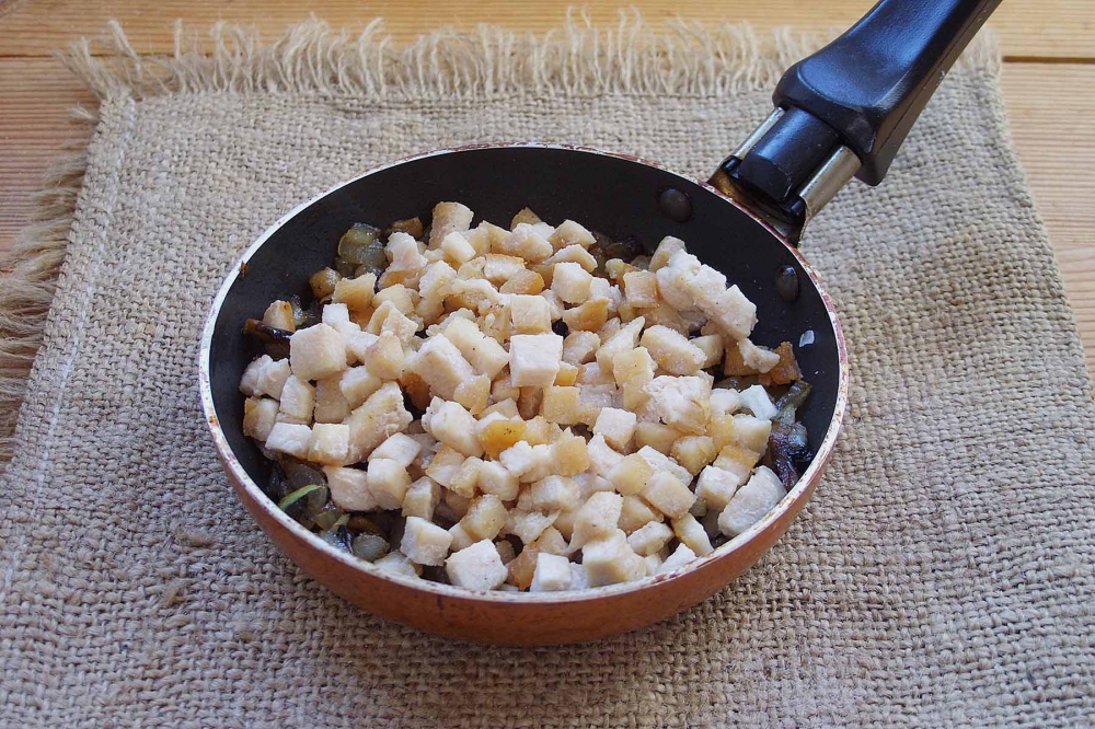 İlk öncə göbələkləri yaxşıca yuyun. Toyuq filesini xırda kub şəklində doğrayın. Kərə yağının yarısını isidin və toyuq filesini yağda qızardın. Zəif ocaqda yarım saat bişən toyuq filesini boşqaba tökün. Daha sonra yağlı tavada xırda doğranmış soğanları yumşalanadək bişirin. Üzərinə nazik dilimlənmiş göbələkləri də əlavə edib 2-3 dəqiqə bişirin. Xırda doğranmış sarımsaq, duz və istiot vurub qarışdırın. Üzərinə boşqaba tökdüyünüz qızardılmış toyuq filesini və xamanı əlavə edib qarışdırın. Ocaqda qabarcıqlar yaranana qədər isidin və rəndələnmiş pendiri üzərinə səpin. Pendir əriyənədək 1-2 dəqiqə saxlayın. Toyuqlu və göbələkli Jülyen yeməyini isti halda süfrəyə verilməlidir.