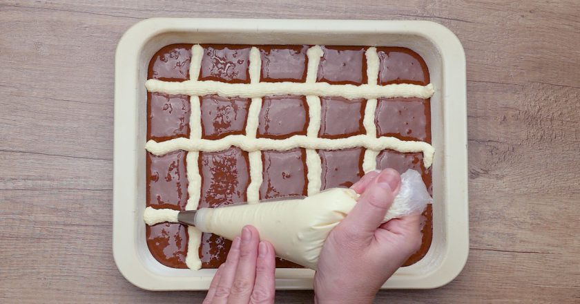 İçliyi hazırlamaq üçün başqa bir qabda kəsmik, şəkər tozu, vanil, nişasta və yumurtanı yaxşıca qarışdırıb konditer torbasına tökün. 20×30 sm ölçülü formanı yağlayın. Şokoladlı xəmiri formaya yayıb hamarlayın. Daha sonra konditer torbasında olan içliyi zolaqlar formasında şokoladlı xəmirin üzərindən tökün. Əvəlcədən 180 dərəcə qızdırlmış sobada 30 dəqiqə bişirin.