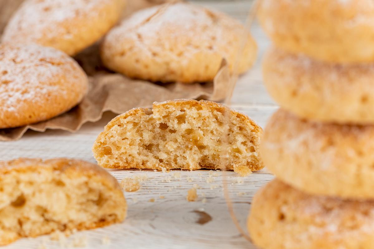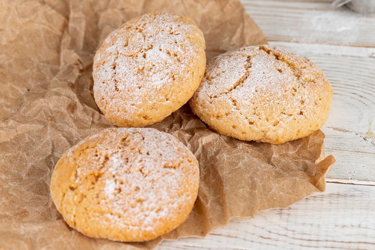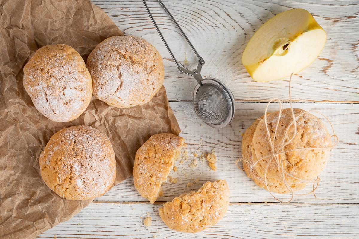 Kərə yağını kiçik qazanda əridin. Üzərinə qabığı soyulmuş, xırda doğranmış almanı və darçın tozunu töküb qarışdırın. Ocağın üstündə almaların suyu çəkilənə qədər bişirin. Daha sonra bişmiş almaları ocaqdan götürüb üzərinə limon suyu töküb blenderlə püre halına gətirin. Bir qabda alma püresinin üzərinə umurta , şəkər tozu və kərə yağı töküb qarışdırın. Ələnmiş un, duz və qabartma tozu əlavə edib yumşaq yapışqan xəmir yoğurun.Xəmirdən 1 xörək qaşığı qədər götürüb dairələr yuvarlayın. Dairələri əlinizi isladaraq yuvarlamağınız məsləhətdir. Yağlı kağız sərilmiş soba sinisinə aralıqlarla yerləşdirib 30 dəqiqəlik soyucuya yerləşdirin. Soyuducudan çıxarıb dairələri bir-bir una bulayıb yağlı kağız sinisinə yeləşdirin. Xəmirlərin üzərinə yüngül basın. Əvvəlcədən 180 dərəcə qızdırılmış sobada 25-30 dəqiqə bişirin. Bişən peçenyeləri soyudun və üzərinə şəkər kirşanı səpib süfrəyə verin.