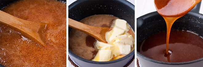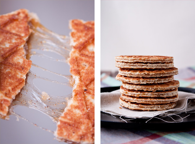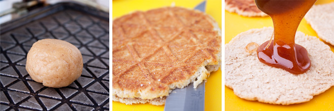 Karameli hazırlamaq üçün balaca qazançada qarğıdalı siropu ( və ya bal), qəhvəyi şəkər tozu və darçını qarışdırın. Qazançanı ocağa qoyub zəif ocaqda 10-15 dəqiqə şəkər əriyənək qarışdırın. Ocaqdan götürün və kərə yağını əlavə edib taxta qaşıqla yaxşıca qarışdırın. Xəmirdən stolüstü tennis topu ölçüsündən kündələr edin. Vafli qəlibini qızdırın və kündələrdən vafli bişirin. İsti vafliləri iki hissəyə ayırın. Arasına karamelli içlikdən yaxın və birləşdirin. Vaflinin kənarları səliqəli olsun deyə peçenye qəlibiylə kəsə bilərsiniz. Qalan kündələri də eyni qayda ilə bişirib hazırlayın. Süfrəyə verməzdən əvvəl 15-20 dəqiqə soyudun.