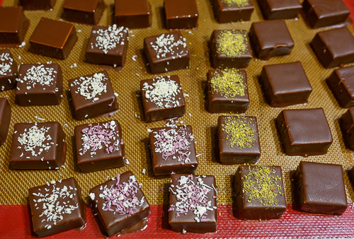 Otaq temperaturunda yumşaldılmış kərə yağını qatılaşdırılmış südlə qatı krem halına gələnədək mikserlə çırpın. Kiçik qazançada aqar-aqarı suyla qarışdırıb zəif ocağa qoyun. Qaynamağa başladıqda 1 dəqiqə qaynadın və üzərinə şəkər tozunu əlavə edib 110 dərəcəyə gələnə qədər qarışdırın. Ocaqdan götürüb azca soyudun. Bir qabda yumurta ağını yaxşıca çırpın.Çırpmağı dayandırmadan ilınan siropu az-az əlavə edin. Çırpdığınız kütlə artıqda,merengi halına gəldikdə yağlı kremi də əlavə edib mikserin aşağı sürətiylə qarışdırın. 24×24 sm ölçülü qəlibə streç salafan sərin və kütləni töküb yayın. Qəlibi soyuducuya yerləşdirin. Tamamilə soyuyan sufleni taxta dəzgahın üzərinə qoyub kvadrat formasında doğrayıb yenidən soyuducuya yerləşdirin. Şokoladı xırdalayıb üzərinə kakao yağı əlavə edib su hamamında və ya mikrodalğalı sobada əridin. İlınan şokolada soyuducudan çıxartdığınız sufleləri batırıb artıq şokoladı süzün. Şokoladı bulanmış sufleləri yağlı kağızın və ya silikon xalçanın üzərinə düzün. Üzərini zövqə görə kokos qırıntıları və xırdalanmış araxislə bəzəyə bilərsiniz. Bu qaydayla bütün sufleləri şokolada bulayın və bərkiməsi üçün soyuducuya yerləşdirin.