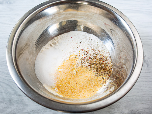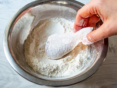 İlk öncə bud və bud dibini kəsin. Bud dibinin sümüyünü ayırın. Bud dibinin filesini iki hissəyə doğrayın. Bir qabda yumurta, soyuq su və xardalı qarışdırın. Başqa bir qabda un, sarımsaq tozu, duz və istiotu töküb qarışdırın. Toyuq ətlərini ilk öncə unlu qarışığa, daha sonra sousa bulayın,yenidən unlu qarışığa bulayın. Toyuq ətini bol yağda (170-175 dərəcə qızdırılmış )bir neçə dəqiqə qızardın. Qızardılmış toyuq ətləri artıq yağı çəkməsi üçün kağız dəsmalın üzərinə qoyun. Daha sonra soba sinisinə düzüb əvvəlcədən 200 dərəcə qızdırılmış sobada 20 dəqiqə bişirin.