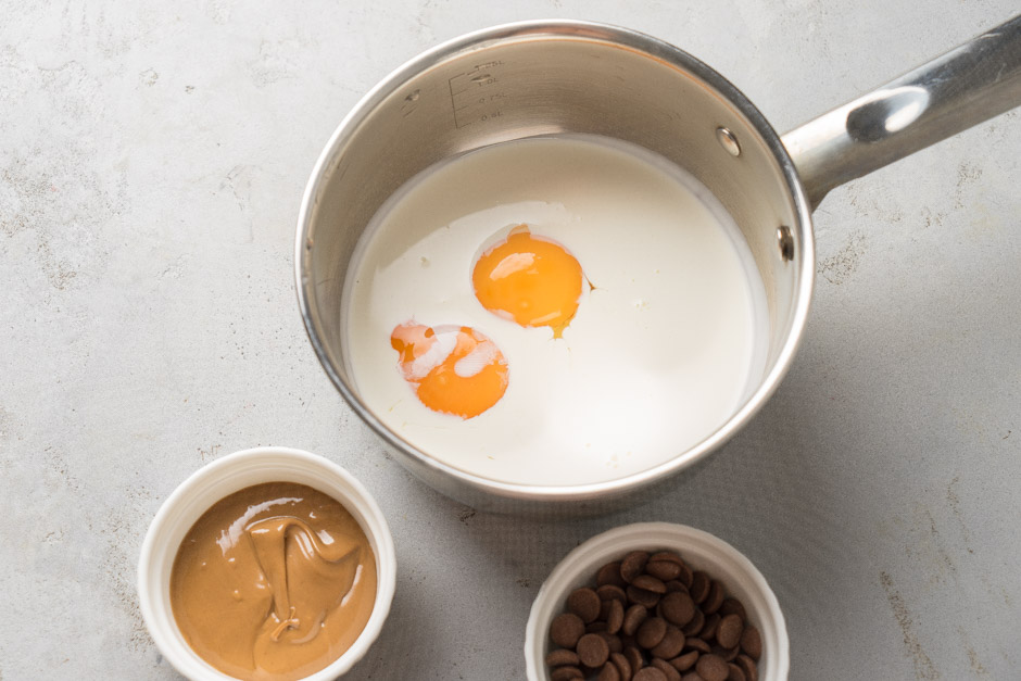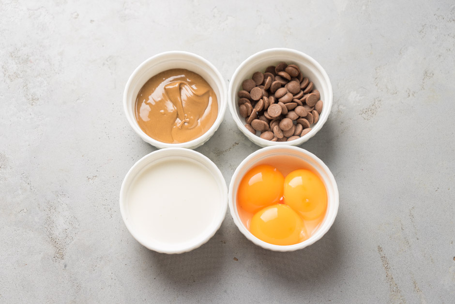 Fındıqlı kremli içliyi hazırlamaq üçün kiçik qazançaya 80 qr yağlı qaymağı və yumurta sarısını tökün. Zəif ocaqda silikon qaşıqla dayanmadan qarışdıraraq 80-82 dərəcəyə qadər bişirin. Silikon qaşıqda barmaq izi qalırsa demək hazırdır. Ölçü stəkanına 25 qr qr südlü şokolad və 80 qr fındıq pralin töküb, üzərinə qaynar qaymağı əlavə edin. Blenderlə yaxşıca qarışdırın. 6 ədədli dairəvi silikon formalara hazırladığınız kütləni bölüşdürün və soyuducunun dondurucu rəfinə yerləşdirin.
