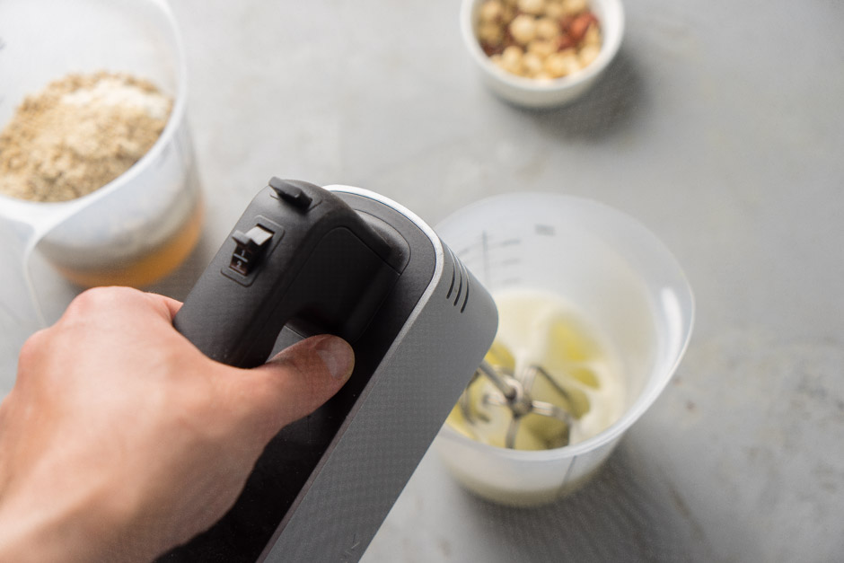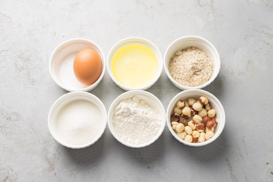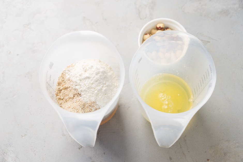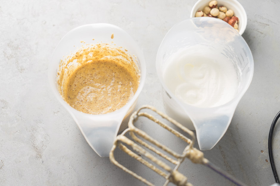 Mikserin qabında 100 qr yumurta ağını 25 qr şəkər tozuyla mikserlə yaxşıca çırpın. Başqa bir qabda 175 qr yumurta, 100 qr şəkər tozu və 125 qr fındıq ununu mikserlə qarışdırın. Üzərinə çırpılmış yumurta kütləsini də əlavə edib ehtiyyatla qarışdırın.