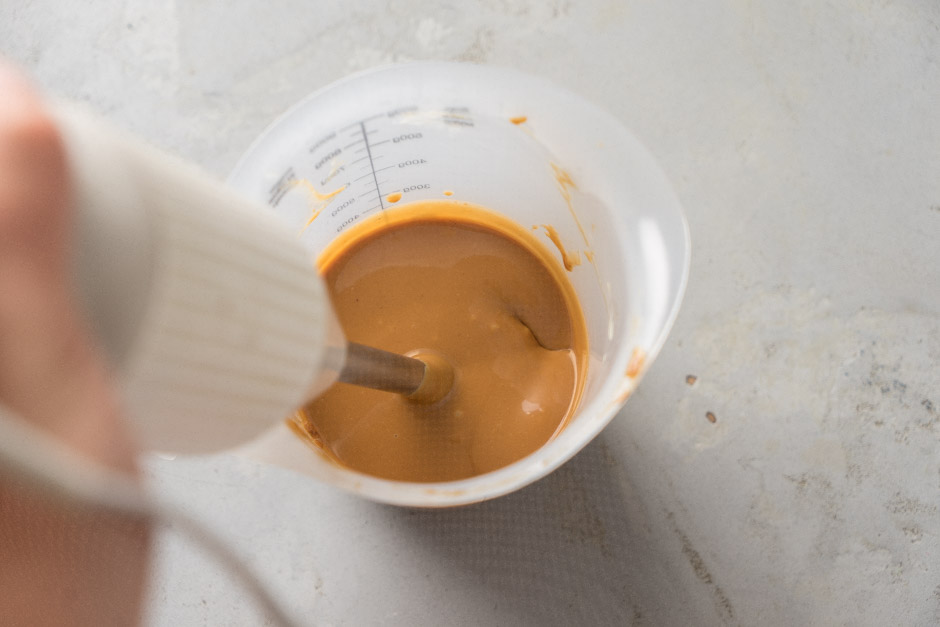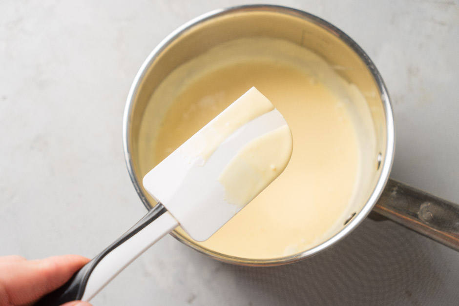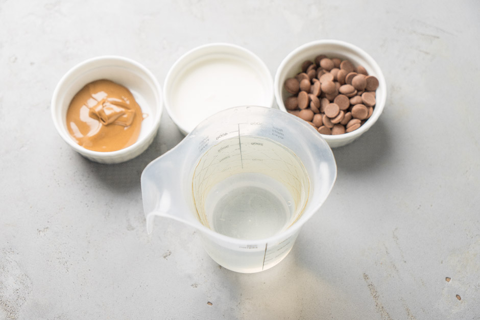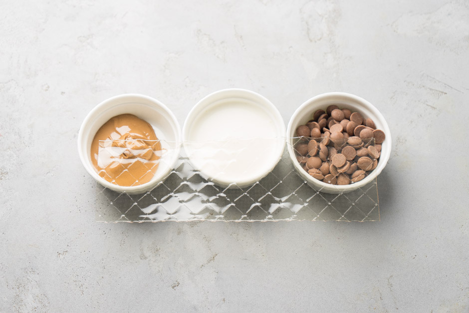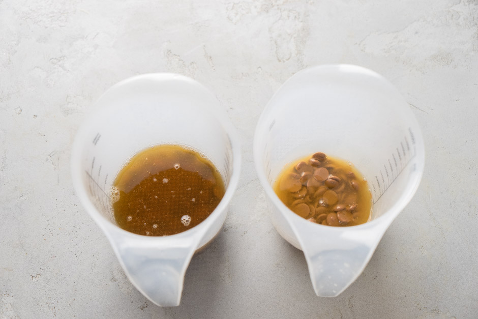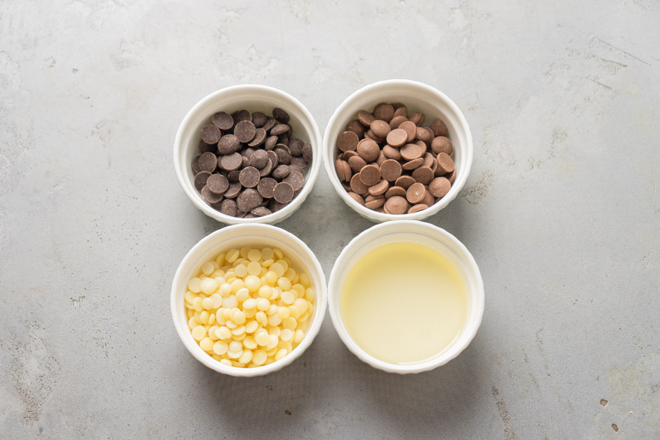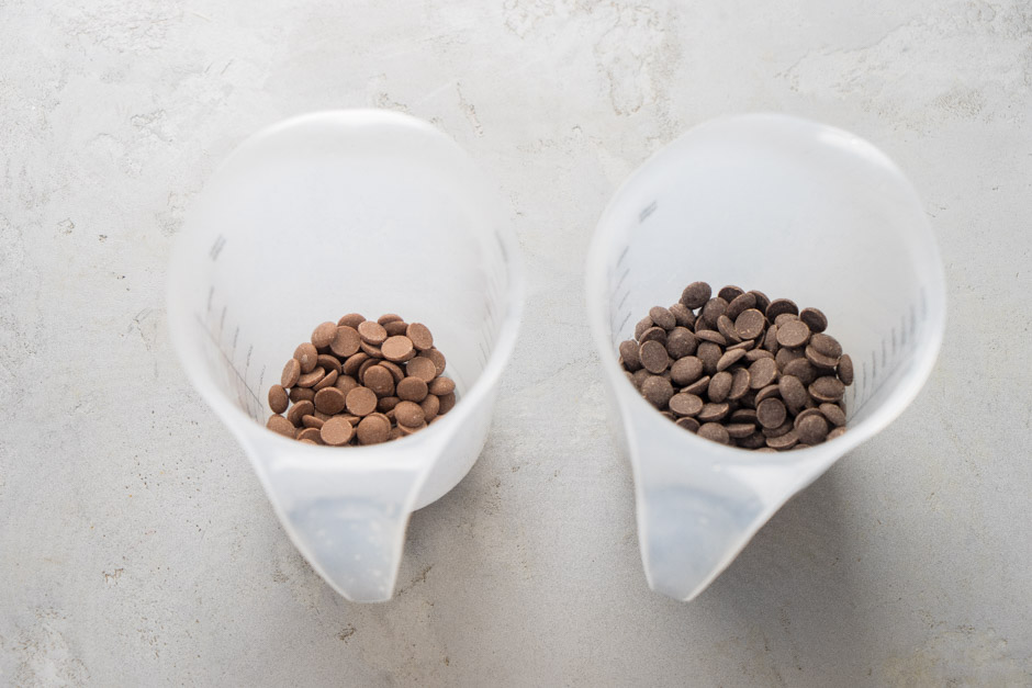 Qlazuru hazırlamaq üçün qazançada 175 qr kakao yağını əridin. Bir ölçü qabına tünd şokoladı, digərinə südlü şokoladı tökün. Tünd şokoladın üzərinə 140 qr, südlü şokoladın üzərinə 35 qr qaynar kakao yağı əlavə edin. Şokoladın əridiyindən əmin olduqdan sonra tünd şokoladın üzərinə 20 qr, südlü şokoladın üzərinə isə 5 qr bitki yağı töküb blenderlə ikisini də yaxşıca qarışdırın.