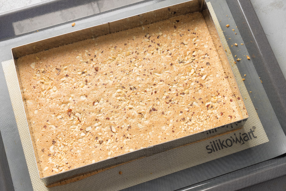 Sobada bişirmək üçün silikon xalçanı soba sinisinə yerləşdirin. Üzərinə düzbucaqlı metal çərçivəni ( 30x 30 sm) də yerləşdirin. Xəmiri qəlibə yayın və üzərinə 20 qr xırdalanmış fındığı səpin. Əvvəlcədən 170 dərəcə qızdırılmış sobada üzəri yüngül qızaranadək bişirin.