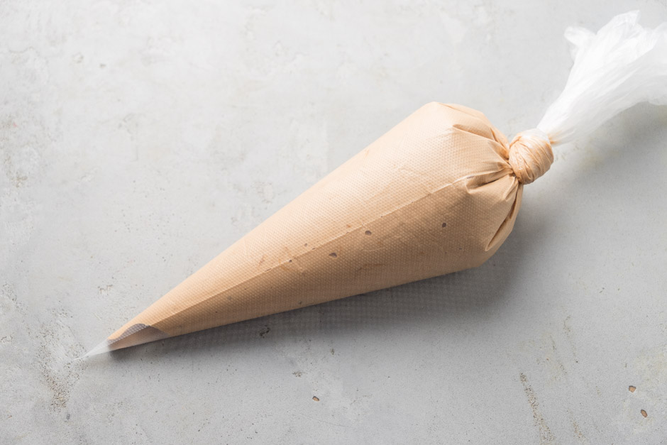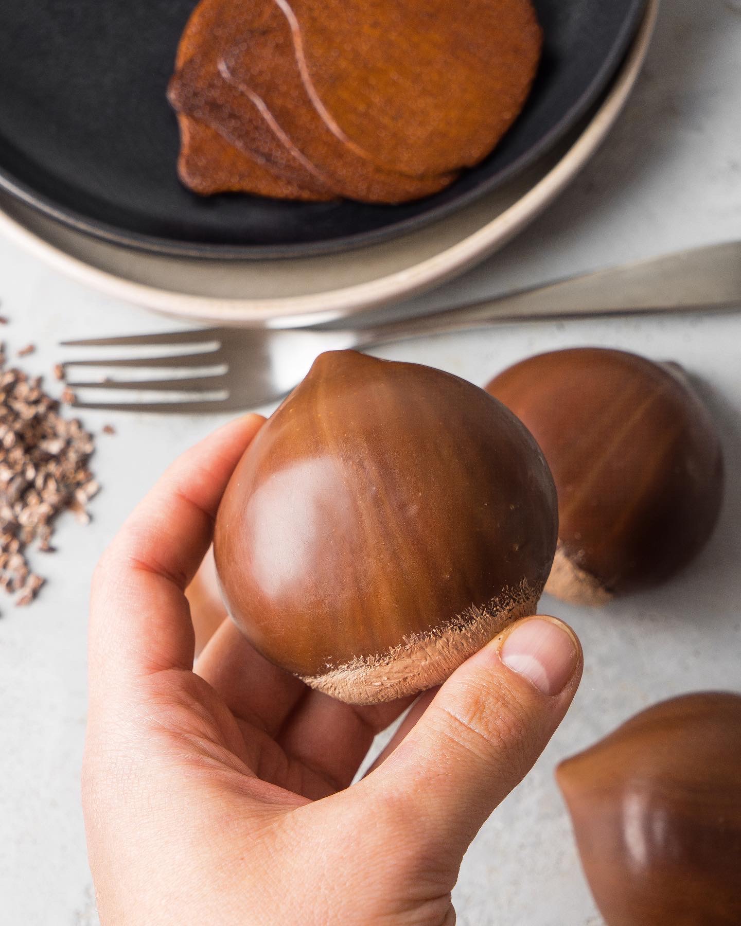 Soyuducudan götürdüyünüz silikon qəlibi içərisindəki pirojnanın birini çıxarın. Aşağı hissəsindən taxta çöp batırıb qlazura hər tərəfli bulayın. Əlinizdə bir tərəfə əyərək (burun hissəsi azca aşağı baxacaq şəkildə) saxlayın. 20 saniyəyə qlazur bərkiyəcək. Fırçayla südlü şokoladdan fındığın arxa hissəsinə cızma hərəkətləri ilə yüngül yaxın. Hazırladığınız pirojnanı çöpdən ehtiyyatla çıxarıb yağlı kağızın üzərinə yerləşdirin. Bu qaydayla qalan pirojnaları da qlazura bulayın.