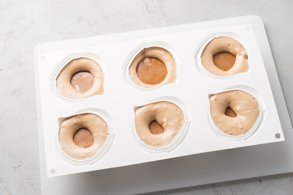 Fındıqlı biskvitdən fındıq formasında qəliblərlə 6 ədəd kəsin. Fındıq formalı silikon qəlibin yarısına qədər hazırladığınız mussla doldurun. Üzərinə dondurulmuş fındıqlı kremli içliyi yerləşdirib yüngül batırın, əgər ehtiyac yaranarsa mussdan azca əlavə edə bilərsiniz. Daha sonra üzərinə fındılıq biskviti yerləşdirin. Bu qaydayla 6 ədəd qəlibləri doldurun və soyuducunun dondurucu rəfinə yerləşdirin.