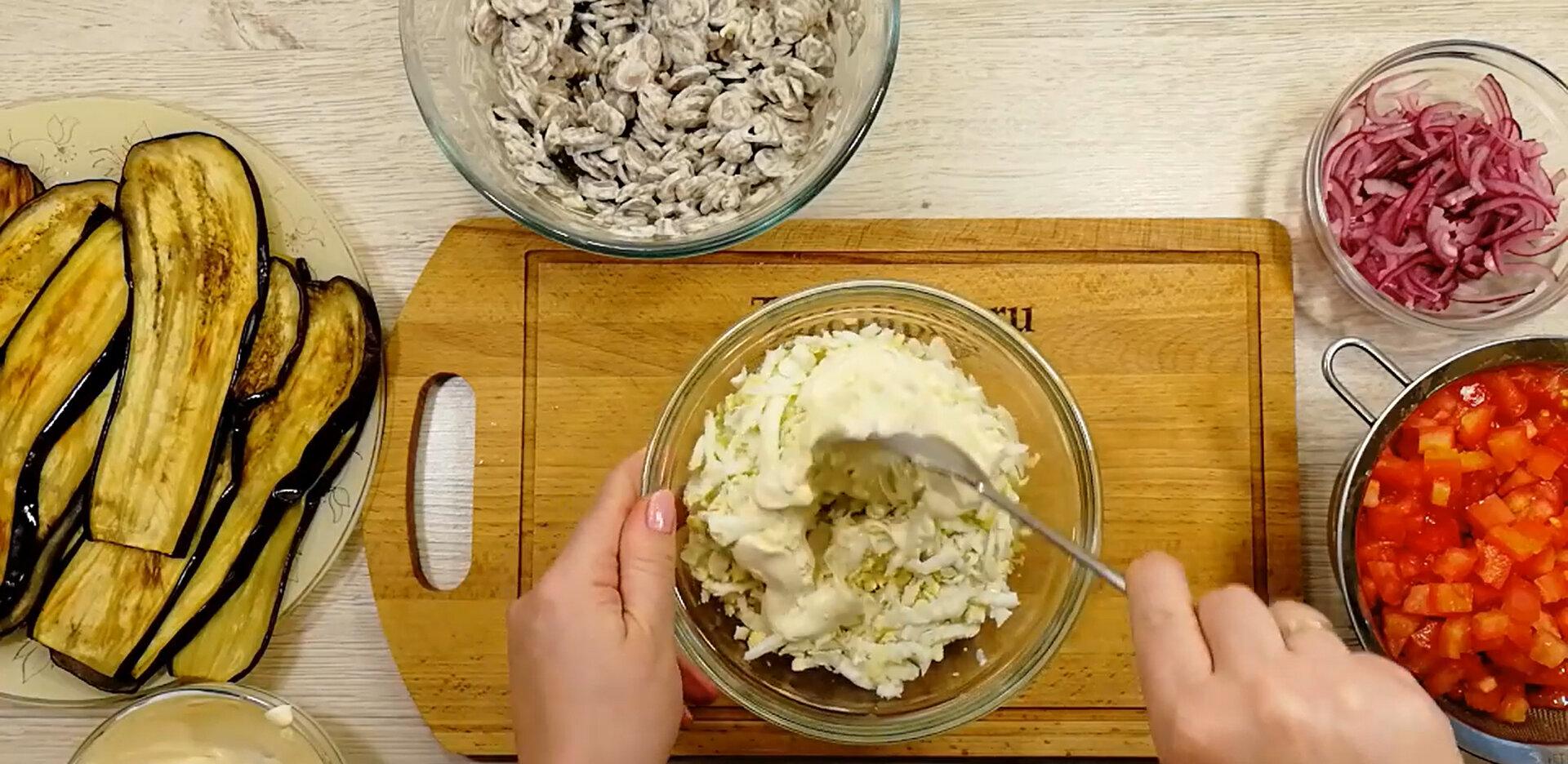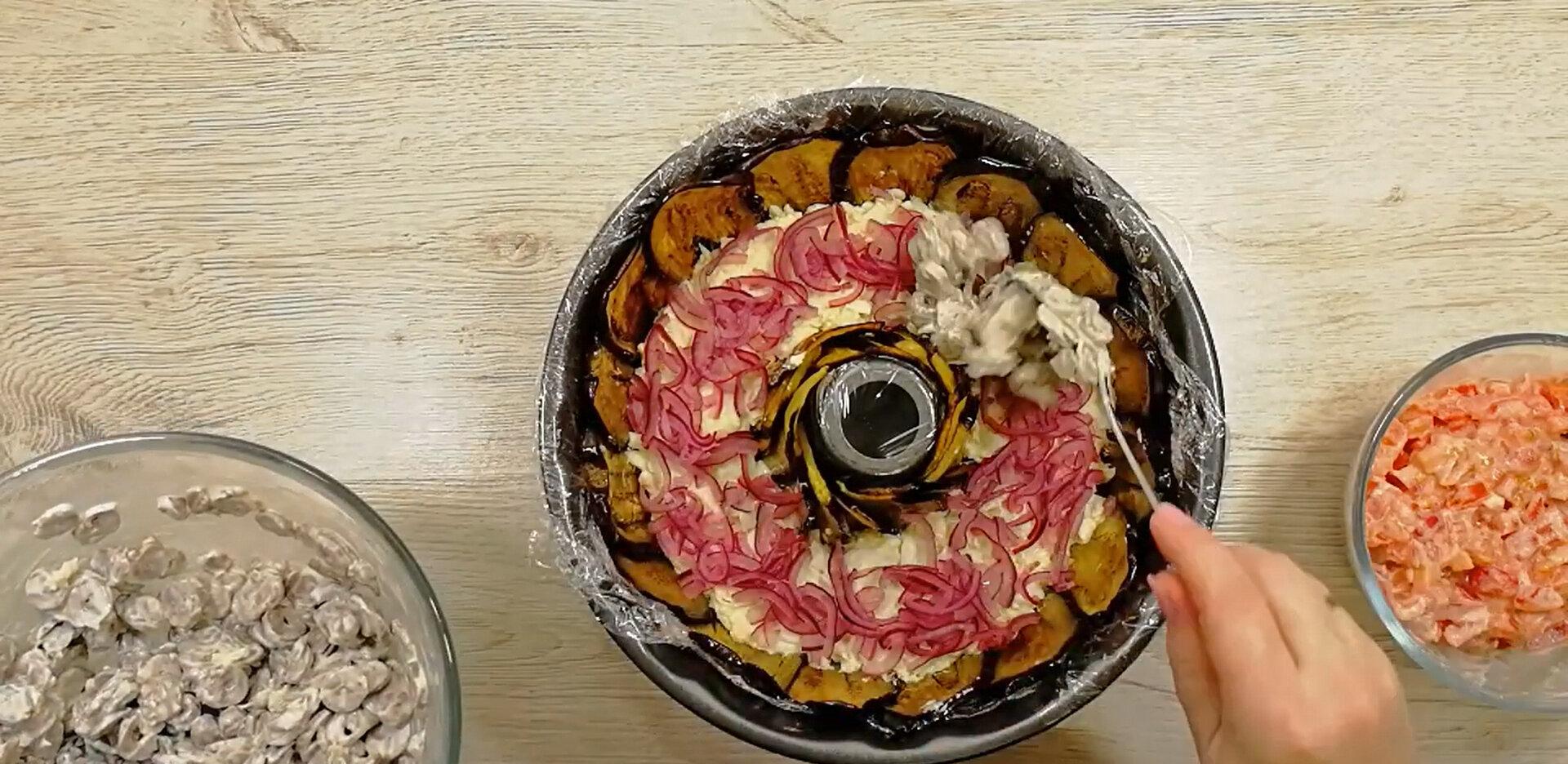 Salatı hazırlamaq üçün streç salafan sərilmiş qəlibə bişmiş badımcan dilimlərini yaxın-yaxın düzün (qəlibin hər tərəfi badımcanlarla örtülməlidir). İlk qat üçün yumurtalı qarışığı tölüb yayın. Üzərinə marinə olunmuş soğan, daha sonra mayonezli ürəyi yayın. Ən son qata pomidorlu qarışığı töküb yayın. Qəlibin kənarlarından çıxan badımcanlarla salatı bükün. Qalan badımcan dilimləriylə salatın açıq qalan hissəsini də örtün.  Salatın üzərini streç salafanla örtüb 2 saatlıq soyuducuya yerləşdirin. Saatın tamamında salatı soyucudan çıxarıb üzərinə boşqab qoyub qəlibi çevirin. Streç salafanı çıxarıb salatı xırdalanmış qoz ləpəsi və doğranmış cəfəriylə bəzəyin. Dadlı salat hazırdır.