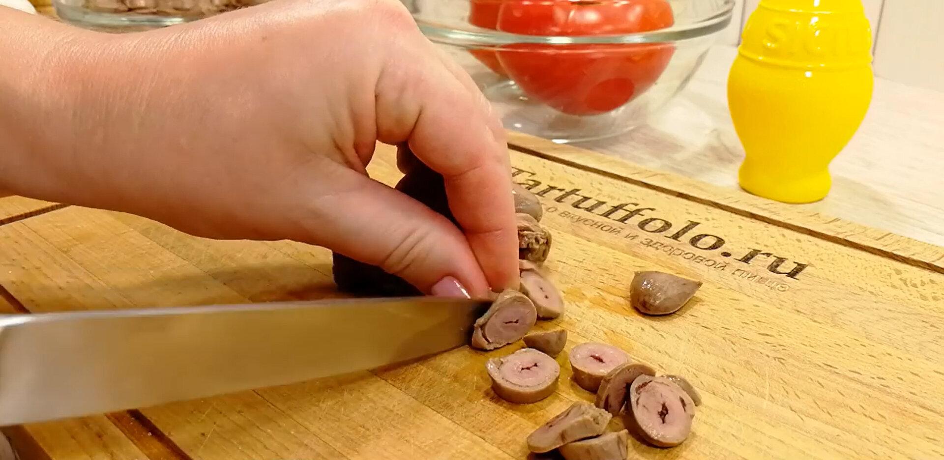 Toyuq ürəyini əvvəlcədən duzlu suda 40 dəqiqə bişirin. Yumurtaları da suda bişirib soyudun. Soğanı yarım halqa doğrayıb bir qaba tökün. Üzərinə çimdik duz, çimdik şəkər tozu, 2 xörək qaşığı limon suyu və 1 xörək qaşığı uksus töküb qarışdırın. Soğanın marinə olması üçün kənarda saxlayın. Bişmiş toyuq ürəyini xırda doğrayın. Bişib soyuyan yumurtaları sürtgəcin iri gözündən keçirin. Pomidorları kub formasında doğrayın və süzgəcə qoyun ki, suyu süzülsün. Bir qabda mayonezin üzərinə xama,sarımsaqəzəndən keçirilmiş sarımsaq, xardal və zövqə görə duz əlavə edib qarışdırın. Bir qabda sürtgəcdən keçirilmiş yumurtaya mayonezli qarışıqdan 2 xörək qaşığı töküb qarışdırın. Başqa bir qabda doğranmış toyuq ürəyinin üzərinə mayonezli qarışıqdan 2 xörək qaşığı töküb qarışdırın. Başqa bir qabda doğranmış, suyu süzülmüş pomidorun üzərinə 1 çay qaşığı mayonezli qarışıqdan töküb qarışdırın.