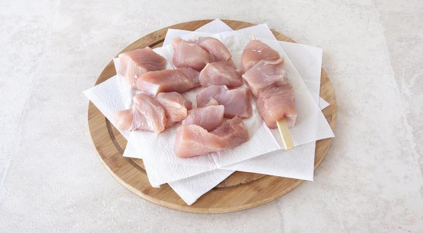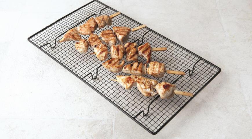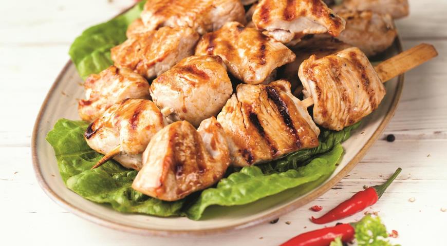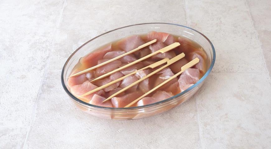 Hinduşka filesini marinad etmək üçün solinadı hazırlayın. Bir qazanda su, duz, şəkər tozu, istiot, soyulmadan əzilmiş sarımsaq ( və ya qabığı soyulmuş ) və qarni buketini (kəklikotu, cəfəri və dəfnə yarpağı)töküb qarışdırın. Qazanı ocağa qoyub 5 dəqiqə qaynadıb ocaqdan götürün və soyudun. Hinduşka filesinin üzərindəki nazik pərdəni soyun (əgər varsa). Fileni uzunsov tikələr formasında ( 5x2x3 sm ölçüdə) doğrayın. Ət tikələri soyuyan solinada 24 saatlıq marinada qoyun (2 saatdan sonra sərin yerdə saxlayın). Ətlə birlikdə taxta şişləri də məhlula qoya bilərsiniz. Manqalı hazırlayın və ya qrili maksimum dərəcədə qızdırın. Marinad olunmuş ətləri kağız dəsmalın üzərinə düzüb suyunu qurudun. Daha sonra ətlərin üzərinə frçayla ərinmiş yağ yaxın. Ətləri taxta və ya dəmir şişlərə keçirib manqalda və ya qrildə yaxşıca bişirin. Bişən kababları folqa kağızının üzərinə 3-4 dəqiqəlik düzün. Daha sonra şirin çili sousuyla birgə süfrəyə verə bilərsiniz.
