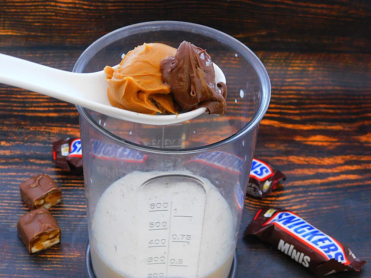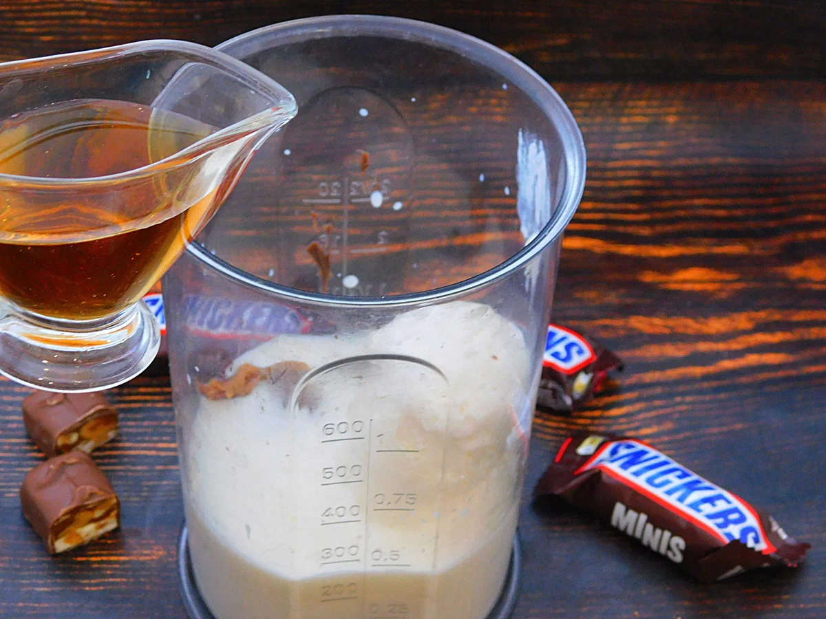 İlk öncə südü çırpma qabına tökün. İki mini Snickersləri əlavə edin, birini üzərini bəzəmək üçün saxlayın. Şokolad pastasını, fıstıq pastasını və dondurmanı da əlavə edin. Daha sonra karamelli siropu da əlavə edib blenderlə yaxşıca çırpın. Hazır kokteyli stəkan və ya bakallara tökün. Üzərini çırpılmış qaymaqla və snickers konfet dilimləri ilə bəzəyin. Zövqə görə ərinmiş şokolad və ya karamel də tökə bilərsiniz.