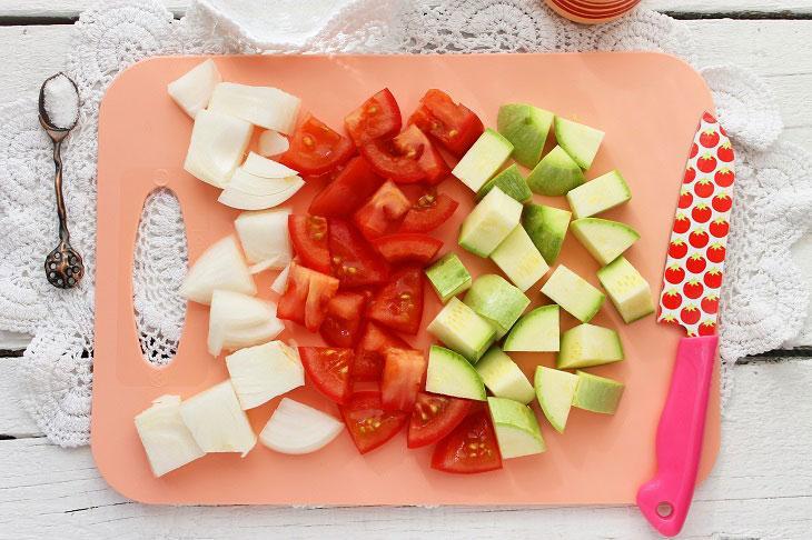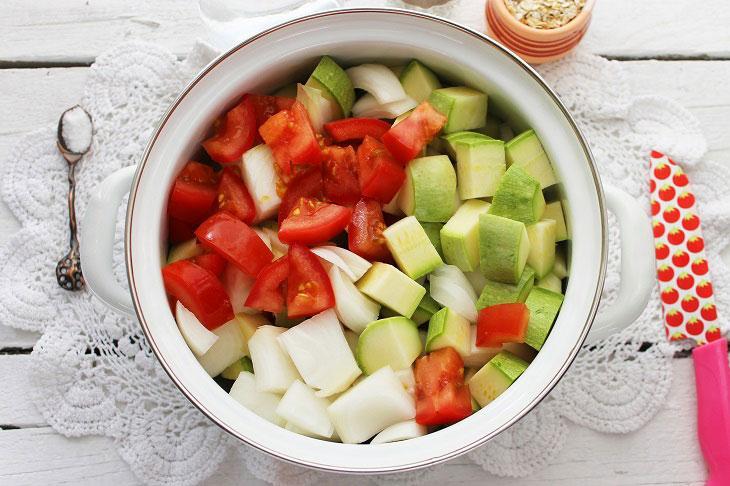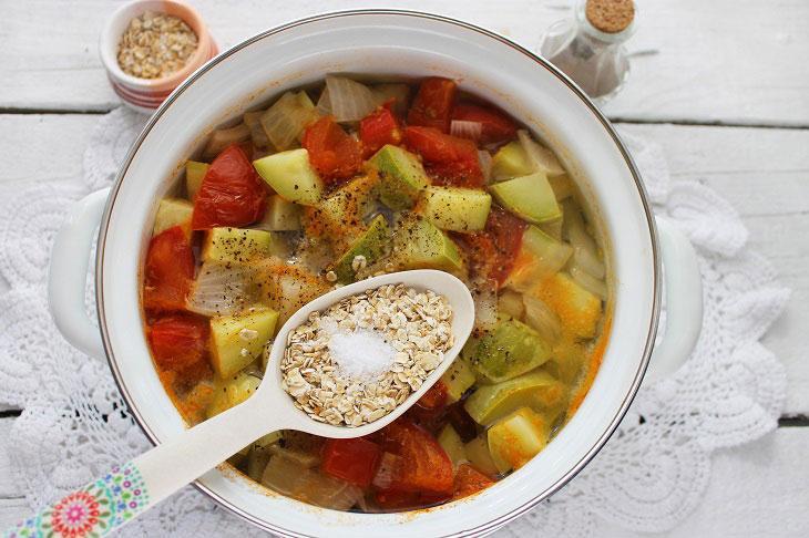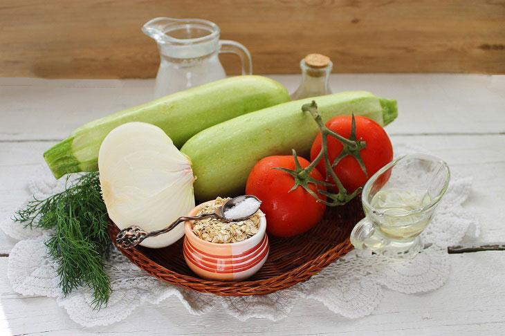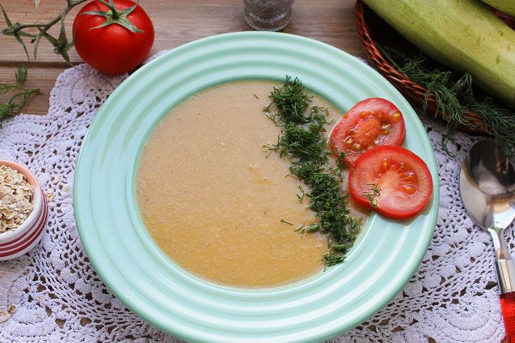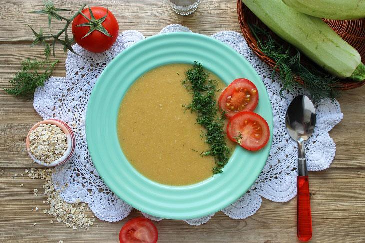 Təzə, tumsuz kabakları və pomidoru yaxşıca yuyun. Soğanın da qabığını soyub yuyun. Tərəvəzləri iri kub formasında doğrayın. Bir qazana doğranmış pomidor, kabak, soğan və qaynar su töküb 15-20 dəqiqə bişirin. Bişən tərəvəzlərə duz, istiot və yulaf yarması töküb 2-3 dəqiqə bişirin. Şorbanı ocaqdan götürüb qapağı bağlı şəkildə 5 dəqiqə kənarda saxlayın. Daha sonra əl blenderiylə şorbanı püre halına gələnə qədər yaxşıca qarışdırın. Şorbaya günəbaxan yağını da əlavə edib qarışdırın. Hazır şorbanı porsionluq kasalara bölüşdürün və üzərini doğranmış şüyüdlə bəzəyin.