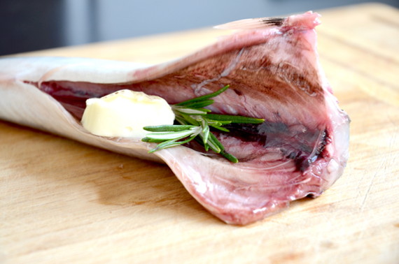 İlk öncə skumbriya balığını təmizləyib yaxşıca yuyun. Üzgəç, baş və quyruq hissəsini kəsib atın. Balığın üzərindən bıçaqla kəsiklər atın və 1 xörək qaşığı bitki yağı səpin. Balığın içərisinə kərə yağı dilimi və 1 budaq rozmarin yerləşdirin. Balığın üstünü iki tərəfli duzlayıb istiot səpin. Tavaya 1 xörək qaşığı yağ töküb qızdırın. Balığı qızğın yağda 3 dəqiqə güclü odda hər iki tərəfini qızardın. Daha sonra ocağı zəiflədib tavanı qapağın örtün və zəif odda 5 dəqiqə bişirin. Bu balıq qızartmasınn yanına pomidor salatını hazırlaya bilərsiniz. Bunun üçün 10 ədəd çerri pomidorunu dilimləyin,üzərinə doğranmış 5 ədəd nanə yarpaqları, laym şirəsi, zeytun yağı və duz əlavə edib qarışdırın. Hazır balıq qızartmasını ətirli salatla süfrəyə verə bilərsiniz.