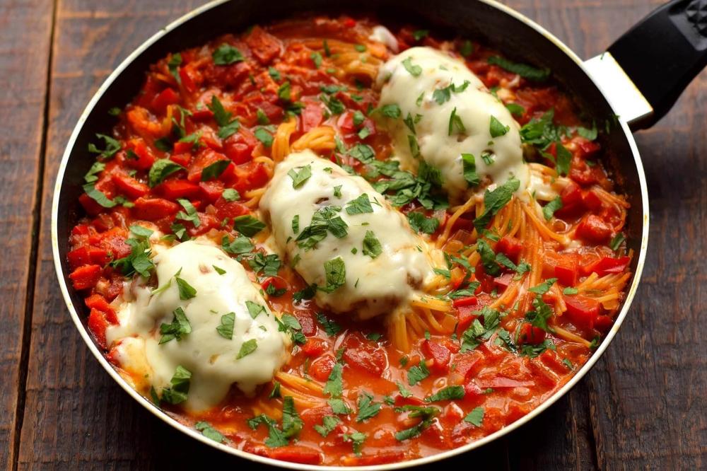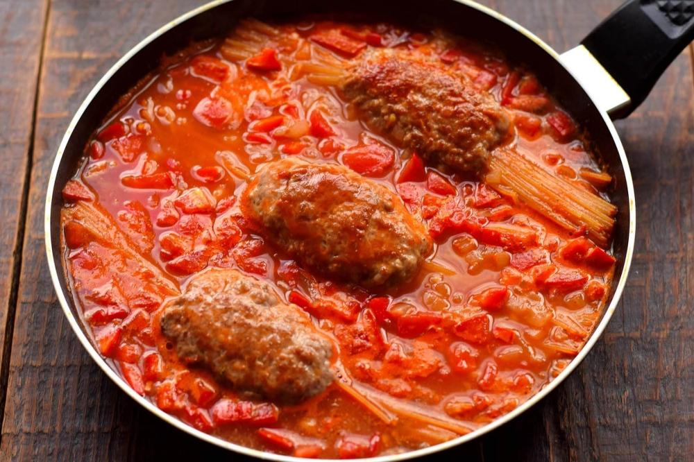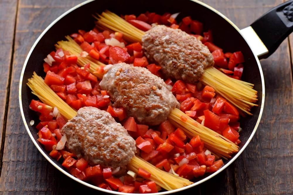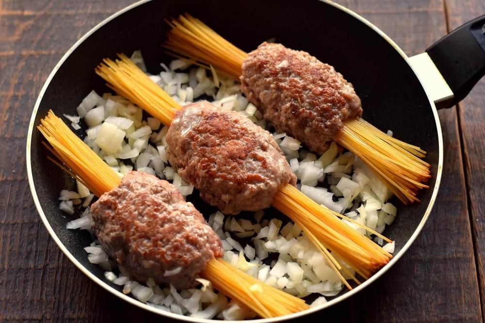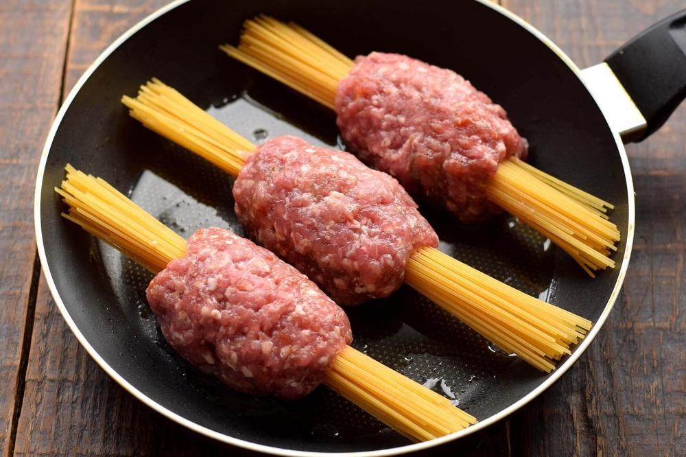 Əvvəlcə qiyməni hazırlayın. Bir qabda qiyməyə acı bibər tozu, quru rozmarin (bibəriyyə), istiot və duz əlavə edib yaxşıca qarışdırın. Çiy spagettini üç bərabər hissəyə bölün.Qiymədən üç ədəd eyni kotelt formasında hazırlayıb, hər birinin ortasına bir porsiya spagetti qoyun.Qiyməni möhkəm sıxın ki, spagetti içəridə qalsın. Tavanı ocaqda qızdırıb yağ əlavə edin. Hazırladığınız qiyməli spagettiləri qızdırılmış tavada hər tərəfi 3 dəqiqə yüksək istilikdə qızardın. Bu vaxt tərəvəzləri hazırlayın. Soğanı, bolqar bibərini və pomidoru bərabər ölçülü kublara kəsin. Sarımsaqları da xırda doğrayın. Əvvəlcə tavaya soğan və sarımsağı əlavə edin, 2 dəqiqə yumşaq olana qədər qovurun. Ocağı orta istiliyə endirin. Sonra doğranmış bibər və pomidorları soğana əlavə edin, tərəvəzləri birlikdə daha 3 dəqiqə qovurun. Tomat pastasını suda həll edib tavaya tökün.Duz da əlavə edin. Spagetti tamamilə tomatla örtülməlidir. Qaynadıqdan sonra istiliyi minimuma endirin, tavanı qapaq ilə örtün, yeməyi 20 dəqiqə bişirin. Pendiri sürtgəcdən keçirib yeməyin üzərinə səpin. Yeməyi qapağı örtülü olaraq 3-5 dəqiqə bişirin ki, pendir tamamilə ərisin. Daha sonra doğranmış cəfəri səpib ocaqdan götürün.