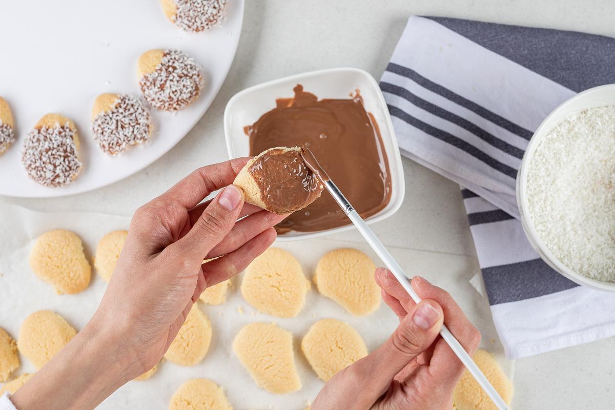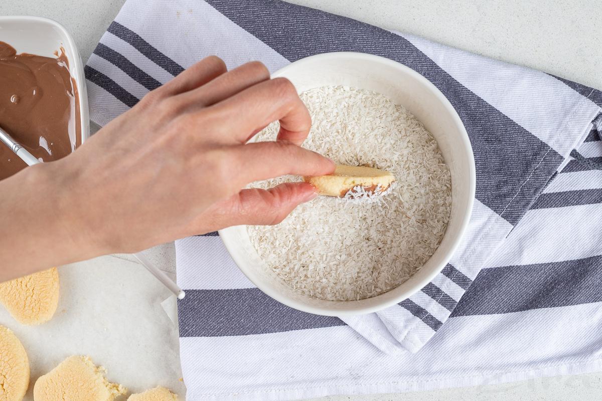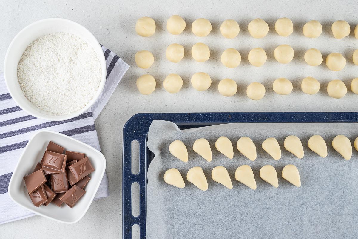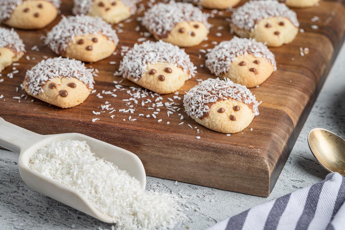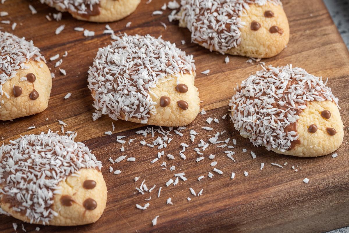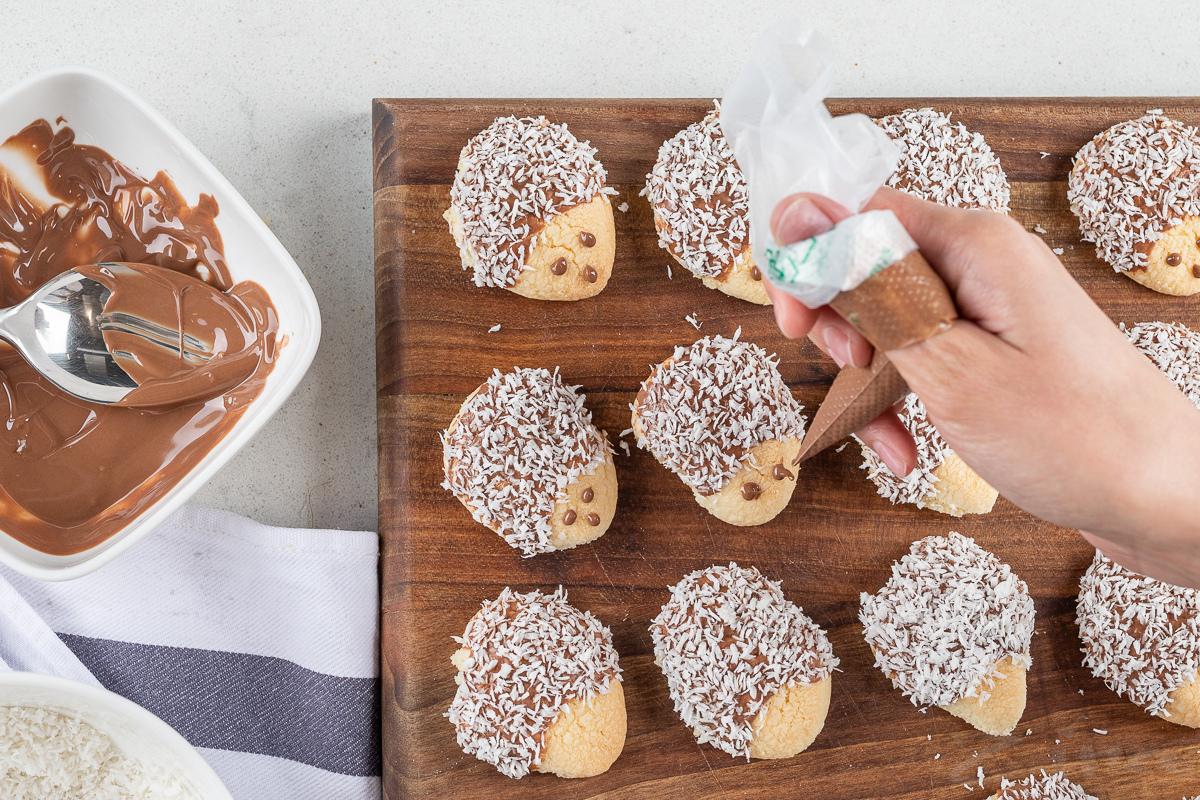 Bir qabda unun üzərinə nişasta və qabartma tozu töküb qarışdırın. Başqa bir qaba yumurta, şəkər tozu və vanil töküb 1-2 dəqiqə mikserlə yaxşıca çırpın. Üzərinə yumşaldılmış kərə yağı əlavə edib çırpmağa davam edin. Yağlı kütləyə unlu qarışığı hissə-hissə əlavə edib yumşaq xəmir yoğurun. Hazır xəmirdən 10-12 qr-lıq kündələr yuvarlayın. Kündələrə uzunsov kirpi forması verin (şəkildəki kimi). Kündələri yağlı kağız sərilmiş soba sinisinə aralıqlarla düzüb əvvəlcədən 180 dərəcə qızdırılmış sobada 15 dəqiqə bişirin. Şokoladı su hamamında əridin. Bişən peçenyelərin üzərinə fırça ilə şokolad çəkin və kokos səpin. Kokos əvəzinə doğranmış qoz-fındıq istifadə edə bilərsiniz. Qalan ərinmiş şokoladı konditer torbasına töküb gözləri və burnu düzəldin. Hazır peçenyeni zövqə görə bəzəyə bilərsiniz.
