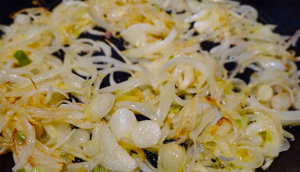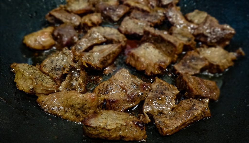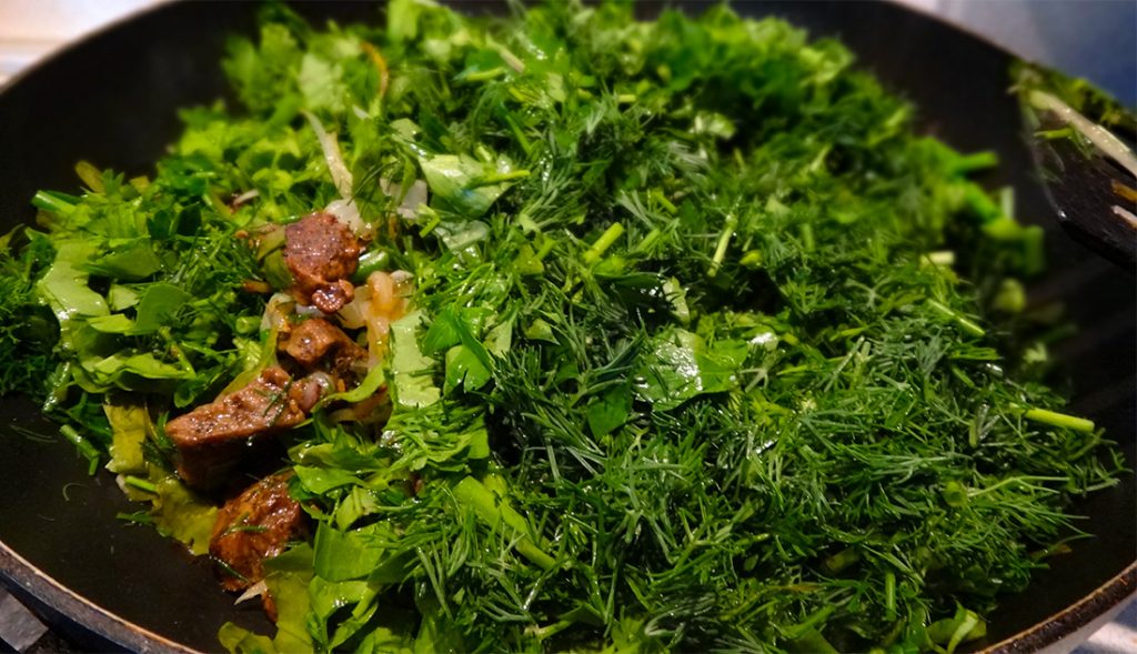 Qovurmanı hazırlamaq üçün əti kiçik tikələrə doğrayın. Tavada ət tikələrini yağda qızarana qədər yaxşıca bişirin. İstiot səpin və üzərinə su əlavə edib yumşalana qədər bişirin. Başqa bir tavada soğanları qovurun. Hazır ətə soğan əlavə edib qarışdırın. Göyərtiləri yuyub suyunu süzün və doğrayın. Əgər qab kiçikdirsə az-az və ya hissə-hissə göyərtini əlavə edin. Göyərtinin rəngi dəyişənə qədər bişirin.