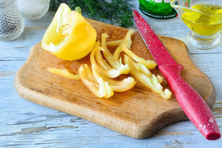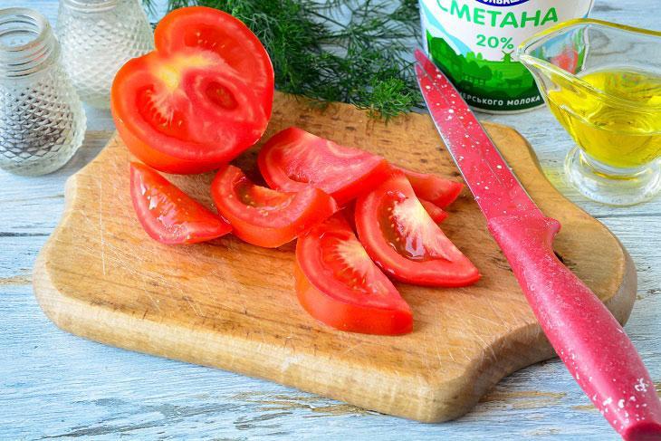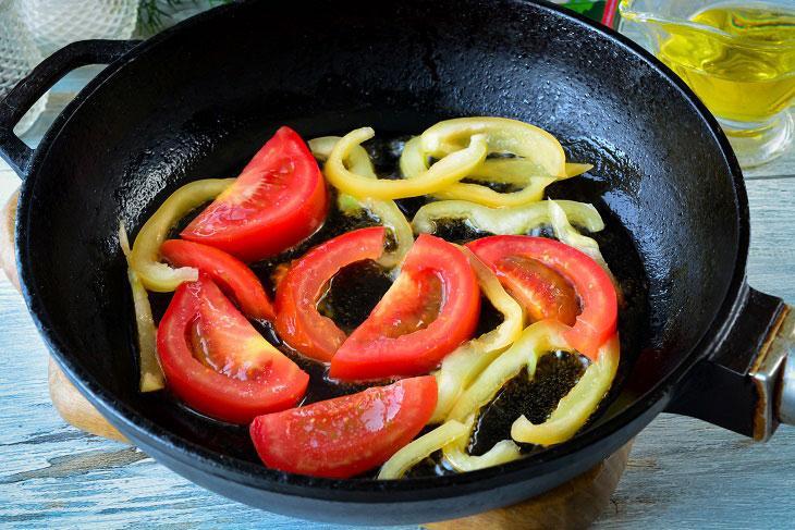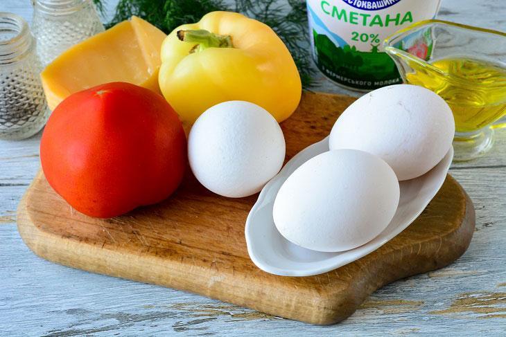 Pomidorları yuyub dilimləyin. Zövqə görə qabığını soyub doğraya bilərsiniz. Bibəri də tumlarından təmizləyib savanvari doğrayın. Tavada yağı qızdırıb pomidor və bibərləri 3-4 dəqiqə yumşalanadək qovurun. Yumurtanı bir qaba sındırıb çəngəllə çırpın. Üzərinə duz, istiot əlavə edib qarışdırın. Yumurtanın üzərinə xama əlavə edib qarışdırın. Qovrulmuş tərəvəzlərin üzərinə xamalı yumurtanı töküb ocağı zəiflədib tavanın qapağını örtüb. Omleti 3 dəqiqə qapağı bağlı şəkildə bişirin. Pendiri sürtgəcdən keçirib omletin üzərinə səpin. Hazır omleti isti halda süfrəyə verin.