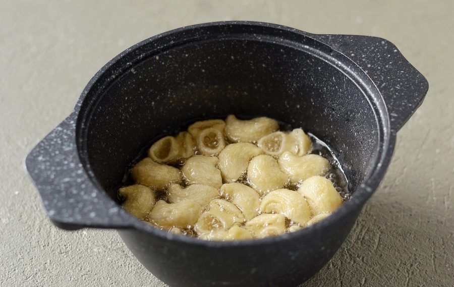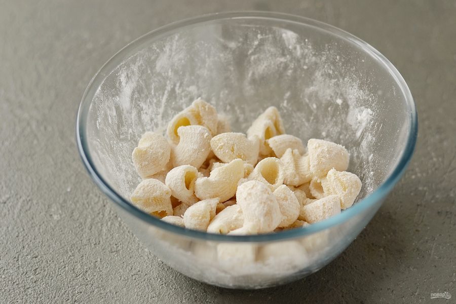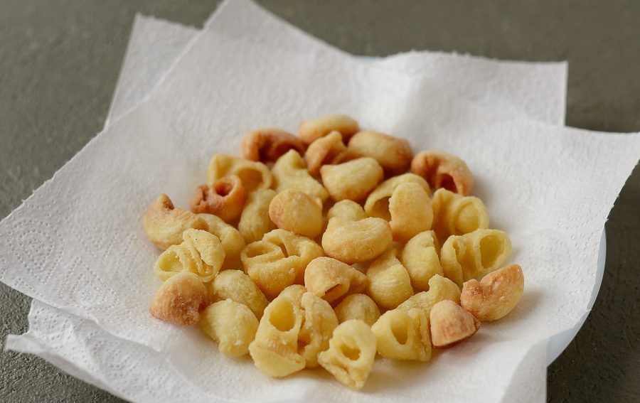 İlk öncə makaronu suda 5 dəqiqə bişirin. Yarım bişən makaronu süzün və üzərinə soyuq su tökün (makaronun bir-birinə yapışmaması üçün). Süzülmüş makaronları salat qabına töküb üzərinə un və nişasta əlavə edib yaxşıca qarışdırın. Makaronları bitki yağında az-az töküb qızardın. Qızardılmış makaronları ayrı bir boşqaba kağız salfetin üstünə qoyun, artıq yağı çəksin deyə. Xırçıldayan makaronları bir boşqaba qoyun, zövqə görə ədviyyat əlavə edib yaxşıca qarışdırın.